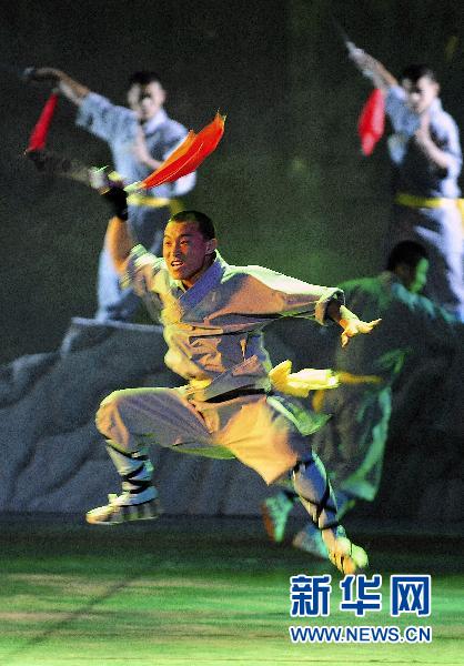 河南少林寺が上海万博のために特別に創作した舞台劇「少林寺の武僧伝奇」が7月から万博会場の総合演芸ホールで上演を開始し、来場者の人気を集めている。同舞台劇は武術や雑技などの要素が織り交ぜたもので、達磨大師が東へ赴き、少室山で武術を身に着け、禅の極意を悟り、禅と武術の融合を書に記すまでの物語を描いている。少林寺の弟子たちの技や美しい舞台美術、照明デザインにより、来場者は万博会場にいながらにして少林寺の芸術を満喫することができる。(編集YH) 「人民網日本語版」より