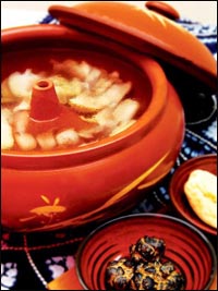 汽鍋鶏(チー・クォ・チー)に使われる鍋は、独特の形をした鍋で、丸くて小さなしゃぶしゃぶ鍋のようですが、真ん中に小さな穴が開いたのがポイントです。この小さな穴から出る蒸気で、しっかりと食材の味が醸し出されるわけです。スープ料理に見えますが、本当は蒸し料理です。