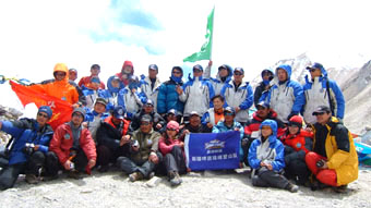 5月15日、チョモランマの天気は快晴。新疆ビールチョモランマ登山隊のリーター楊春風さん、メンバーの安少華さん、任子翔さん、張京川さん、袁イさんからなる5人の登山隊は仕度を整えてベースキャンプを出発しました。このうち、楊春風さん、安少華さんは新疆からの登山家です。
