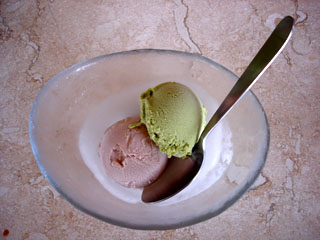 シメはもちろんデザートです。抹茶と紅芋、2種類のアイスクリームでした。