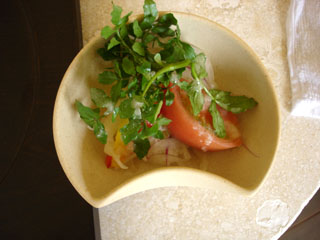 さっそく注文した料理が運ばれてきました。最初は前菜のサラダです。トマト・大根・レタス・タマネギに和風のドレッシングがかかっており、あっさりしていて夏にピッタリな一品です。そして、いよいよメインのジンギスカンです。上等な羊のヒレ肉と、生野菜が運ばれてきました。肉と一緒に、もやし・タマネギ・とうもろこしなど野菜もいっぱい食べられます。ヘルシーライフの発想ですね。肉をジンギスカン鍋の真ん中の部分にのせて焼き、あとはまわりをいろんな野菜で覆います。肉が焼けたら、たれにつけてほおばります。久しぶりの羊肉は、よく食べている牛肉とは一味違って、やっぱり最高です。