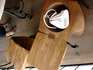 レストランの外観は、とてもおしゃれな雰囲気です。中に入ってみますと、テーブルや椅子などはほとんど木で作られたものでした。すべて手作りだそうです。服などに匂いがつかないように、テラス席を選びました。椅子にはふたがついていて、バッグなどを収納できるようになっています。シンプルなデザインですが、生活の快適さと便利さを求める日本人ならではの工夫が感じられました。