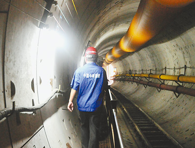 このトンネルは全長約3100メートル、長江の平均水位からの深さは48メートルで、上下線分離方式となっている。写真は6日、武漢地下鉄の2号線トンネル内を通行する工事関係者。(編集SN)