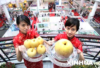 第1回中国国際果物野菜産業博覧会が11日、上海国際農業展覧センターで開かれました。世界十数もの国や地区からの企業が出展し、1400種以上の果物や野菜が展示されました。ハイテクや、無公害、有機栽培の野菜や果物は今回博覧会の焦点となっています。山東省莱陽産の重さ1.9キロの梨や、雲南省麗江産の保存期間が110日間の雪桃が人々を魅了しました。(国家経済網より)
