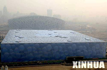 北京オリンピックで水泳競技の会場となる国家遊泳センター(愛称:ウォーター・キューブ)の建設は26日、青い六角形のエアーブロックの最後の一つが天井部分に取り付けられ、全体の封鎖が終わった。着工から3年が経ち、すべての外装工事が終了したことになる。