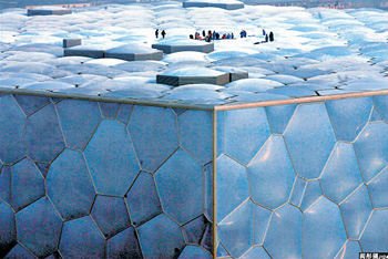 ウォーター・キューブには中国で初めて、フッ素樹脂の一種であるETFEフィルムを採用。世界的に見ても、これほどの面積と複雑な機能を持つETFE使用の建築物は無いという。ウォーター・キューブの完成は2007年末の予定。(編集ID)