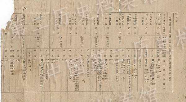 及び部隊などの一覧表(中国第二歴史公文書館提供)